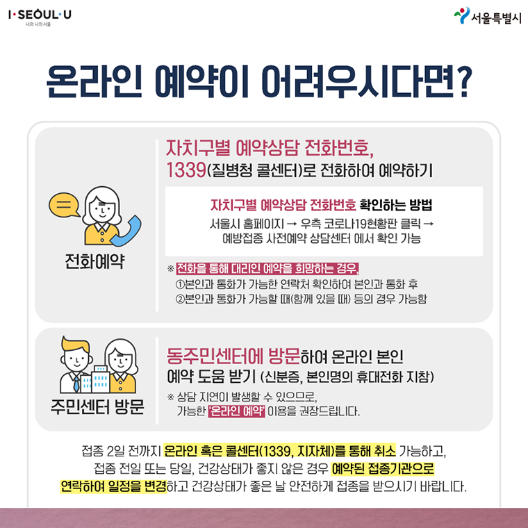 온라인 예약이 어렵다면, 자치구별 예약상담 전화번호, 질병청 콜센터(1339)에서 예약할 수 있습니다.